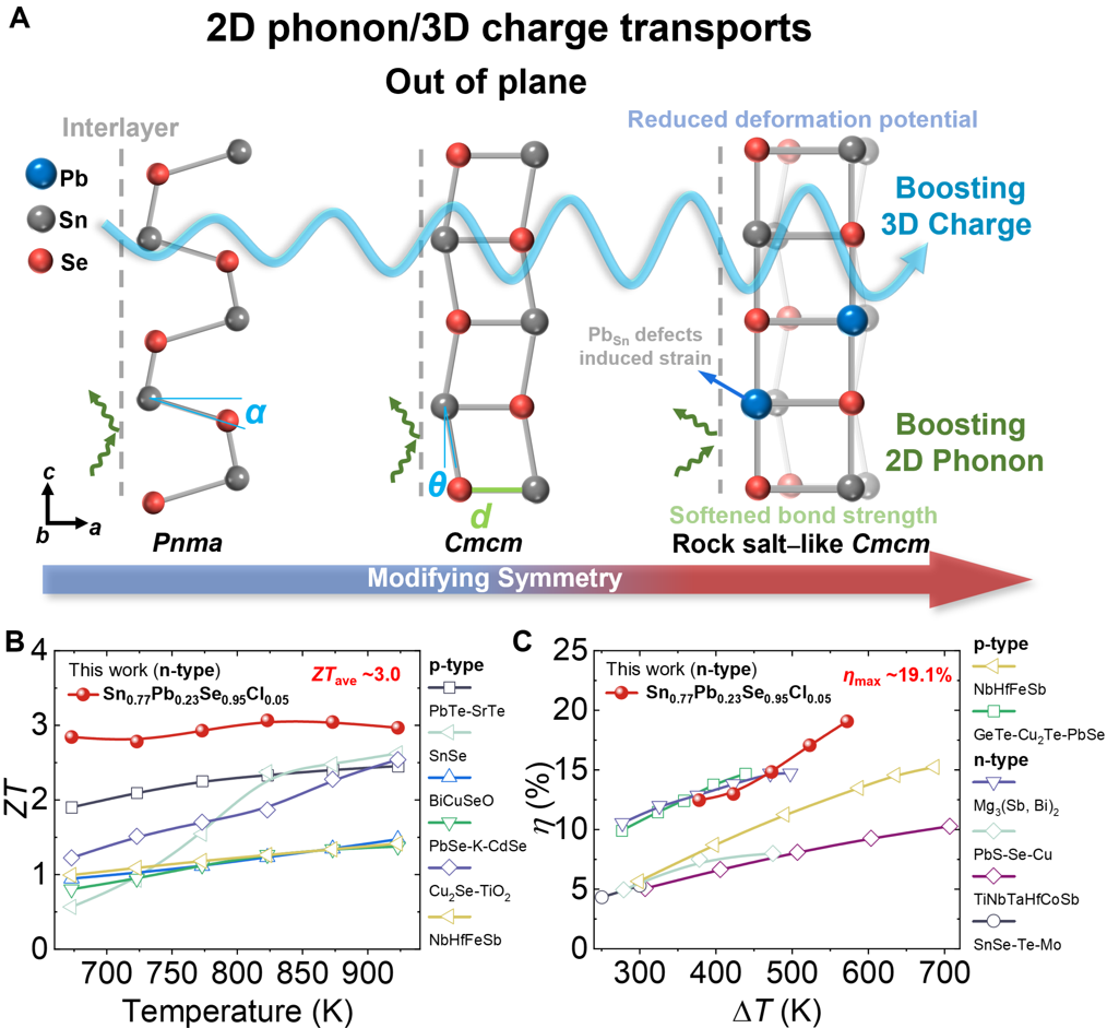 图2. (A) N型SnSe晶体面外“2D声子/3D电荷”传输特性:层状SnSe晶体利用其层结构抑制了(晶格振动)声子传输,但是与声子不同的电子可通过交叠的电荷密度实现电子隧穿;固溶高对称相后显著促进了该传输特性;(B) 与目前先进的P型热电材料的ZT对比图;(C)与目前先进的单臂热电器件的发电效率对比图