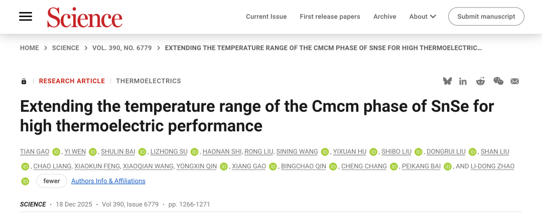 2025年12月19日,国际顶级学术期刊《Science》报道了北京航空航天大学材料科学与工程学院赵立东教授团队在热电材料及器件研究领域取得的最新进展:《Extending the temperature range of the Cmcm phase of SnSe for high thermoelectric performance》。该工作通过在硒化锡(SnSe)材料中大比例固溶高对称立方相PbSe,成功拓宽了SnSe的高温Cmcm相的温度稳定区间,显著增强了N型SnSe晶体面外方向在Cmcm相的“2D声子/3D电荷”传输特性,将N型SnSe晶体在单个温度点(748K)下ZT~3.0的性能扩展至673-923 K的宽温域范围,温区跨度达250K,基于此宽温域下的卓越热电性能实现了~19.1%的发电效率,该报道揭示了N型SnSe晶体在温差发电领域的巨大潜力。2025级博士生高天、文熠副教授、2023级博士生白树林为第一作者,宿力中教授、常诚教授、赵立东教授为通讯作者,北京航空航天大学材料科学与工程学院为第一单位。赵立东教授课题组2025年已发表3篇《Science》,自2014年以来,这是赵立东教授课题组第14次发表Science和Nature正刊。
