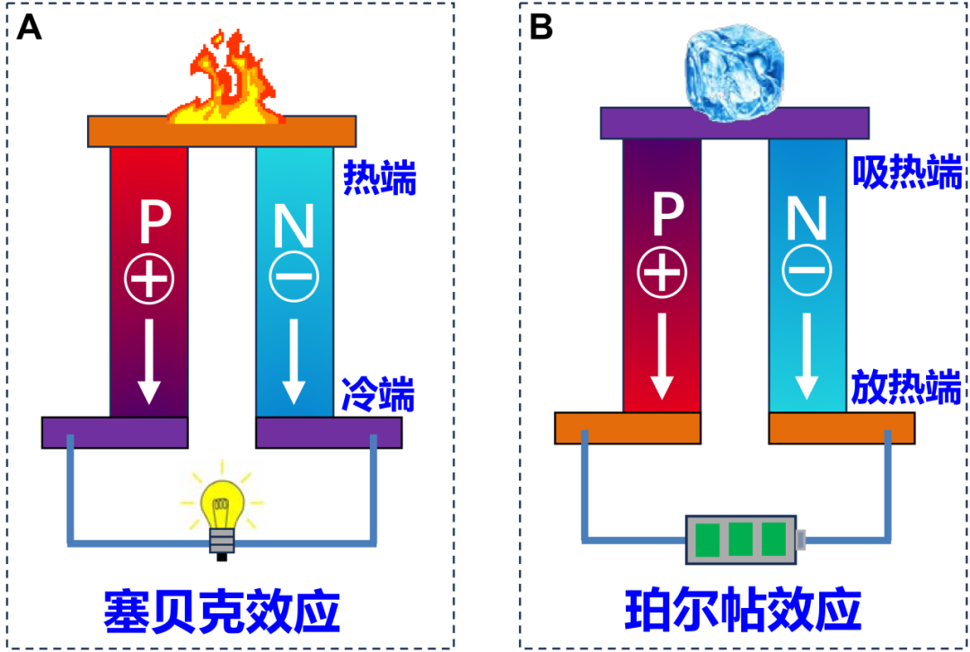 图1. 热电效应:(A) 基于塞贝克效应的温差发电模型; (B) 基于珀尔帖效应的热电制冷模型