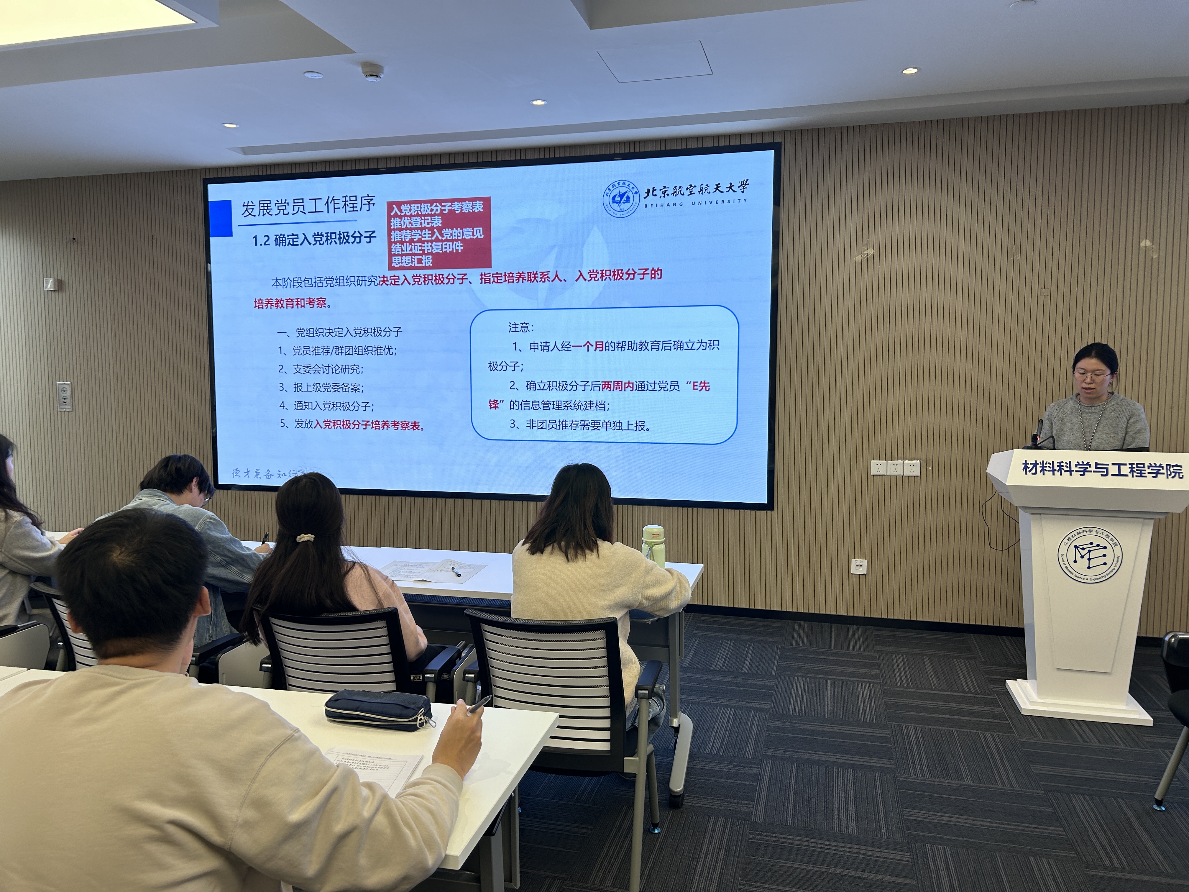 此外,材料学院党委统一组织8学时实践学习。由北航“红船星河”宣讲团讲师董恒君讲授“从C919看高水平科技自立自强”主题党课,结合大国重器研发历程,解读科技自立自强的时代意义,引导发展对象树立“听党话、跟党走”的坚定信念;党务助理石梦琳详细解读发展党员全流程,重点说明“确定发展对象、培养考察、预备党员接收”等关键环节要求,规范入党流程认知,现场还分发《求是》等学习材料,引导学员深化理论思考。11月9日至10日,全体发展对象分批次投身志愿服务活动,在校园环境维护、学业帮扶等实践场景中,以实际行动锤炼党性修养,践行入党初心与使命担当。