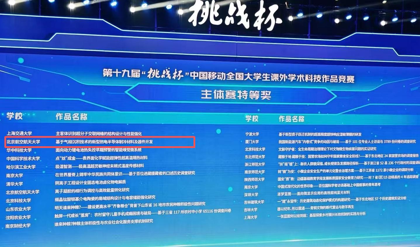(通讯员王睿 冀星)2025年11月,第十九届“挑战杯”全国大学生课外学术科技作品竞赛主体赛在南京大学圆满落幕。北京航空航天大学材料学院全本科生团队凭借项目《基于气相沉积技术的新型热电半导体制冷材料及器件开发》,在激烈角逐中脱颖而出,荣获能源化工组特等奖,实现学院继2019年后再次问鼎“挑战杯”最高荣誉,取得历史性突破!