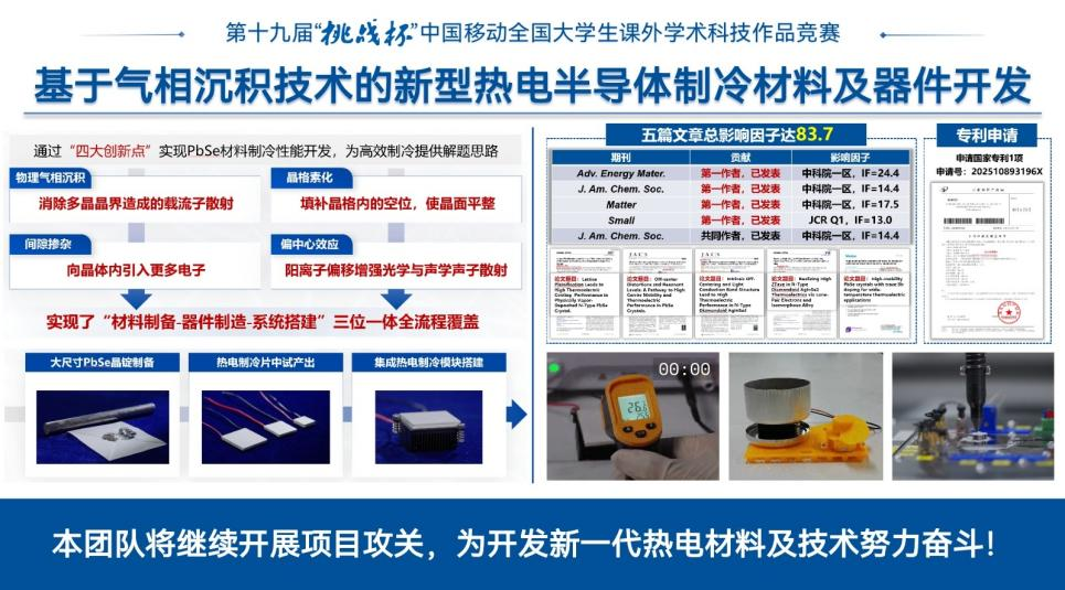 该项目由张致尧、司展、魏寓祥、康健坤、苏婧铱五位本科生组成,指导教师为谢鸿耀副教授、赵立东教授。团队聚焦当前商用热电制冷材料Bi₂Te₃成本高、性能受限等问题,创新性采用物理气相沉积法制备中温区热电材料PbSe,结合晶格素化、间隙掺杂与偏中心效应等多种调控手段,成功研发出一种高性能、低成本的新型热电制冷材料及器件。实验结果显示,该器件最大制冷温差达66K,性能媲美现有商用产品,而单位成本降低72%,具备显著的产业化潜力和市场前景。相关研究成果已在《先进能源材料》(Advanced Energy Materials)、《美国化学会志》(Journal of the American Chemical Society)等国际权威期刊发表论文5篇,累计影响因子达83.7,并已申请国家发明专利1项,获得多位院士专家的高度评价与推荐。