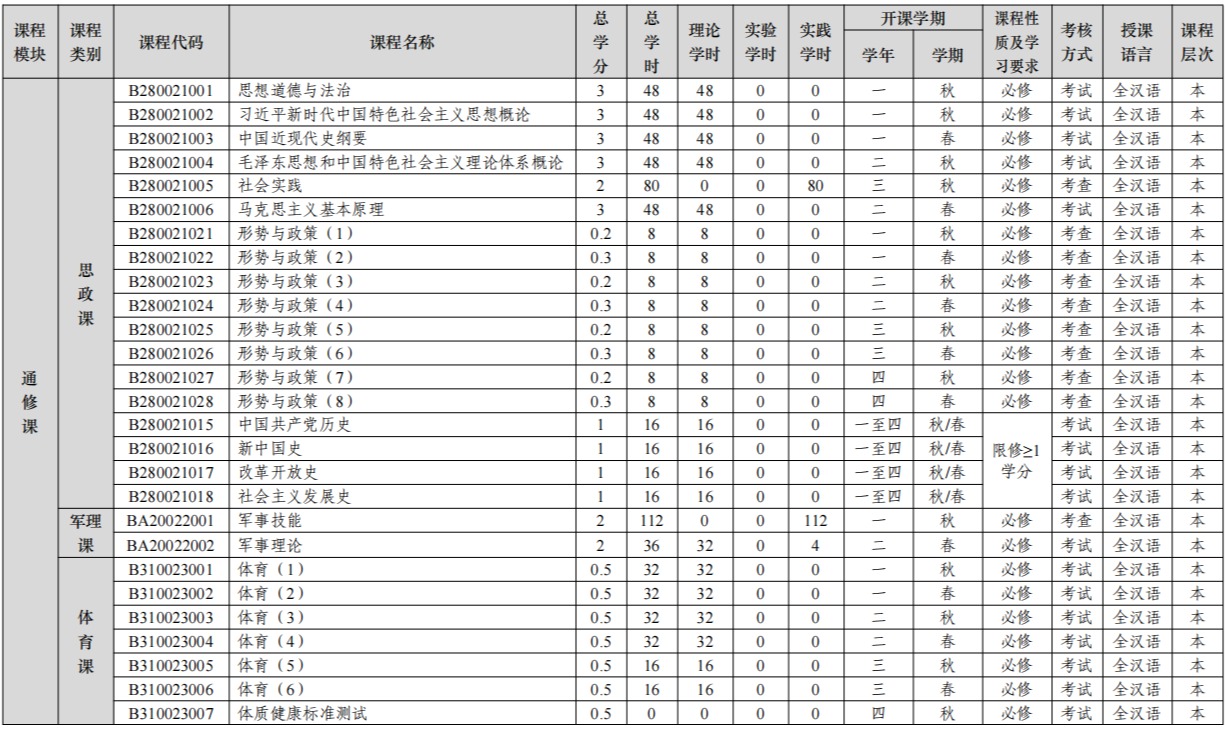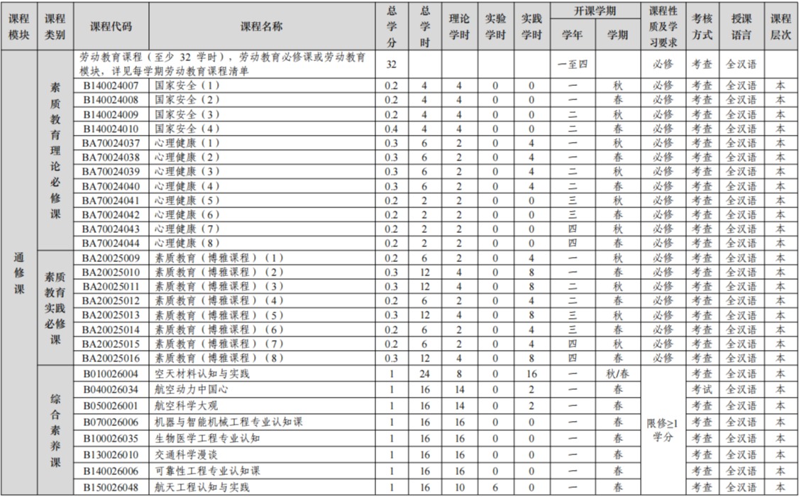 注:外语类课程、思政类课程、军理类课程、体育类课程、美育课程、劳动教育课程、心理健康、国家 安全、素质教育实践必修课等修读要求见相关文件,其中: