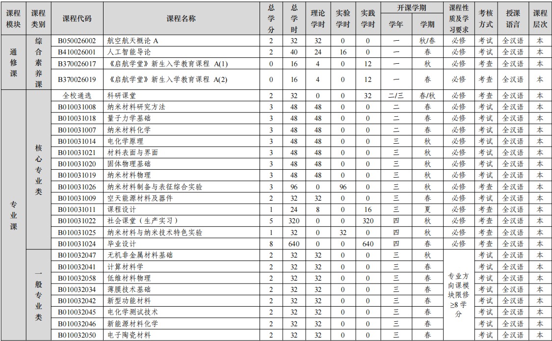 坚持学校“厚植情怀、强化基础、突出实践、科教融通”的人才培养方针,依靠学院在空天能 源材料、特种功能材料领域的基础优势,面向材料科学国际前沿和空天能源国家重要需求发展方向, 夯实自然科学、人文社会科学、工程技术和学科专业基础知识学习,强化正确思想政治素质教育, 着力为我国航空航天等重点纳米材料领域培养服务国家重要需求和引领时代发展的未来领军领导 人才。毕业的学生可以从事纳米、能源、功能器件等新型材料与技术相关的创新研究、系统开发、 工程应用和管理等工作。